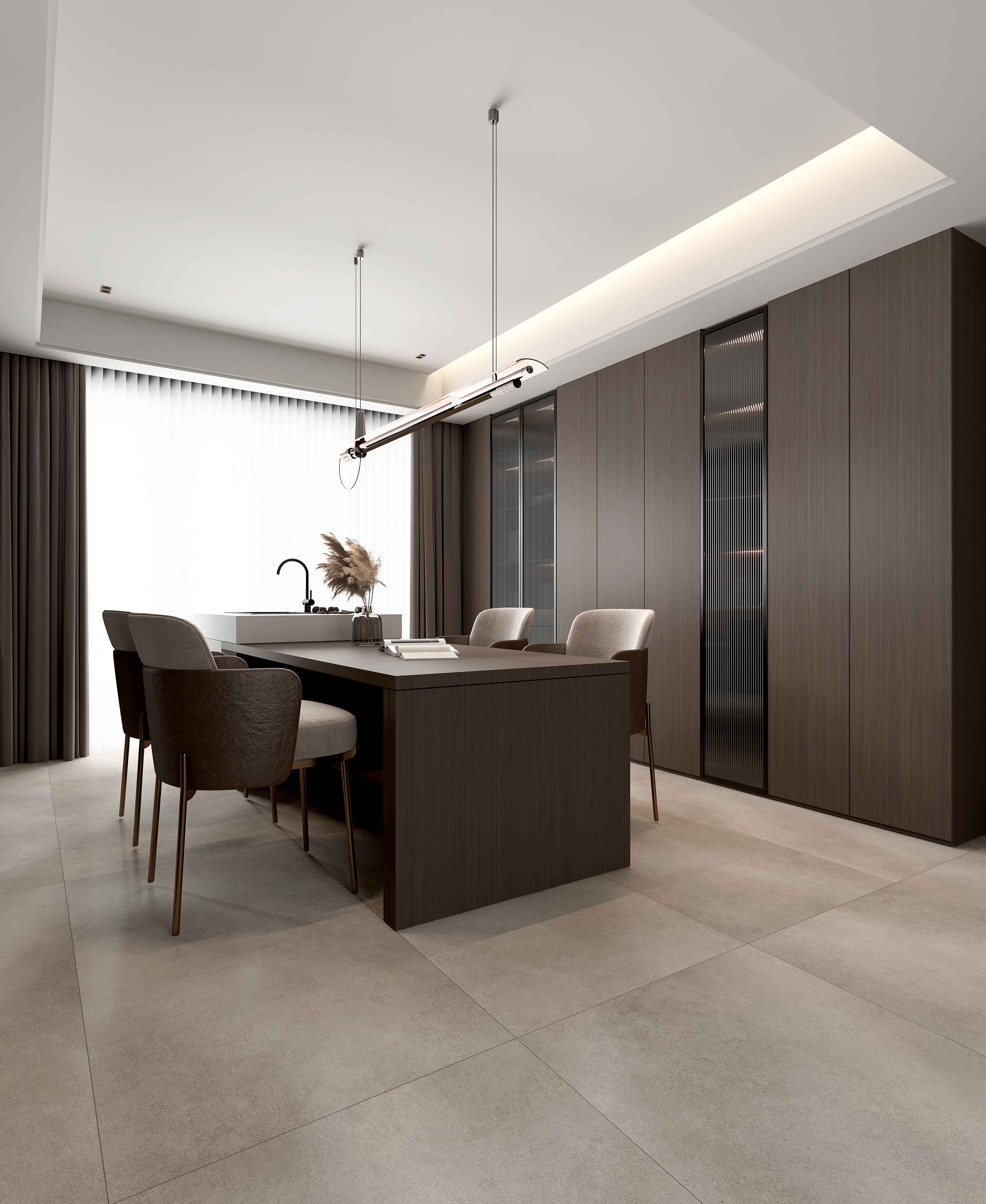 水泥磚為設(shè)計(jì)藍(lán)本,融合細(xì)膩柔和的鹿毛為特點(diǎn),自帶格調(diào)美感和神秘感。部分紋理作高光處理,令設(shè)計(jì)更生動(dòng),整體空間低調(diào)內(nèi)斂而不失細(xì)節(jié)。